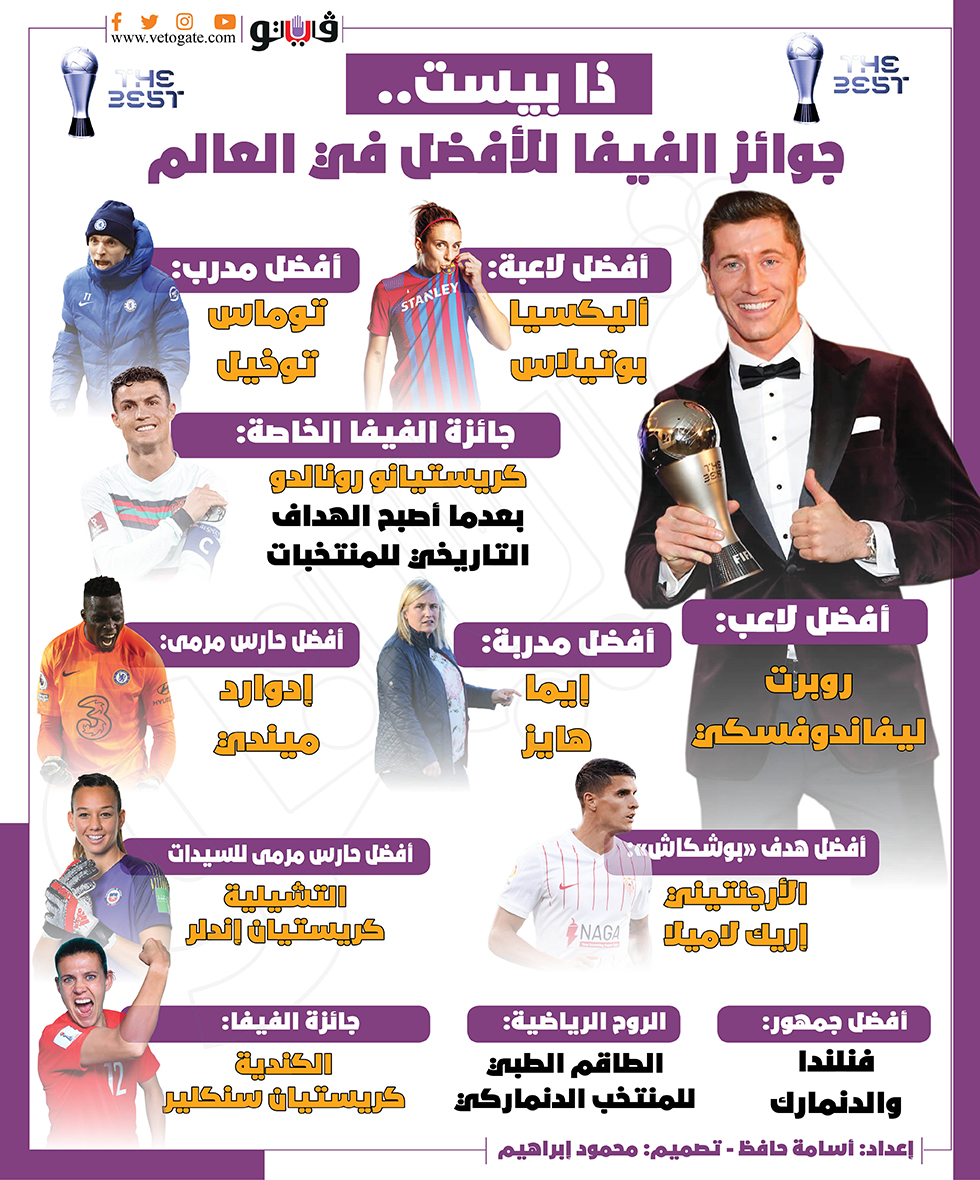 ذا بيست.. جوائز الفيفا للأفضل في العالم الإثنين 17/يناير/2022 - 10:26 م 1/17/2022 10:26:19 PM ليفاندوفسكي اسامة حافظ شارك طباعة 18 حجم الخط شارك طباعة كريستيانو رونالدو الأفضل في العالم جوائز الافضل روبرت ليفاندوفسكي في العالم