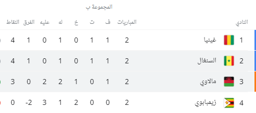 ويتقاسم منتخب السنغال وغينيا صدارة المجموعة برصيد 4 نقاط، مع التساوي في فارق الأهداف ويحتل منتخب مالاوي، المركز الثالث برصيد 3 نقاط، في حين يقبع منتخب زيمبابوي، الذي ودع المسابقة رسميًا، في ذيل الترتيب بلا رصيد.