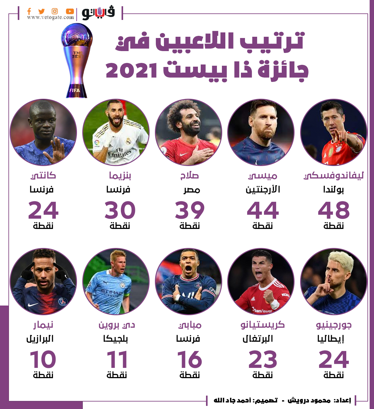 ترتيب اللاعبين في جائزة ذا بيست 2021| إنفوجراف الثلاثاء 18/يناير/2022 - 02:59 م 1/18/2022 2:59:44 PM محمد صلاح محمود درويش شارك طباعة 18 حجم الخط 10 - نيمار البرازيل 10 نقاط شارك طباعة جائزة ذا بيست ذا بيست ليفاندوفسكي ميسي محمد صلاح كريم بنزيما نجولو كانتي كريستيانو رونالدو