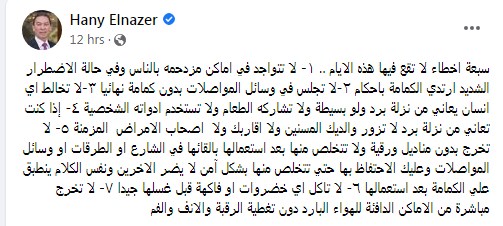 وكتب الدكتور هاني الناظر تدوينة على الفيس بوك: "سبعة أخطاء لا تقع فيها هذه الأيام.. ١- لا تتواجد في اماكن مزدحمه بالناس وفي حالة الاضطرار الشديد ارتدي الكمامة بإحكام ٢-لا تجلس في وسائل المواصلات بدون كمامة نهائيا".
