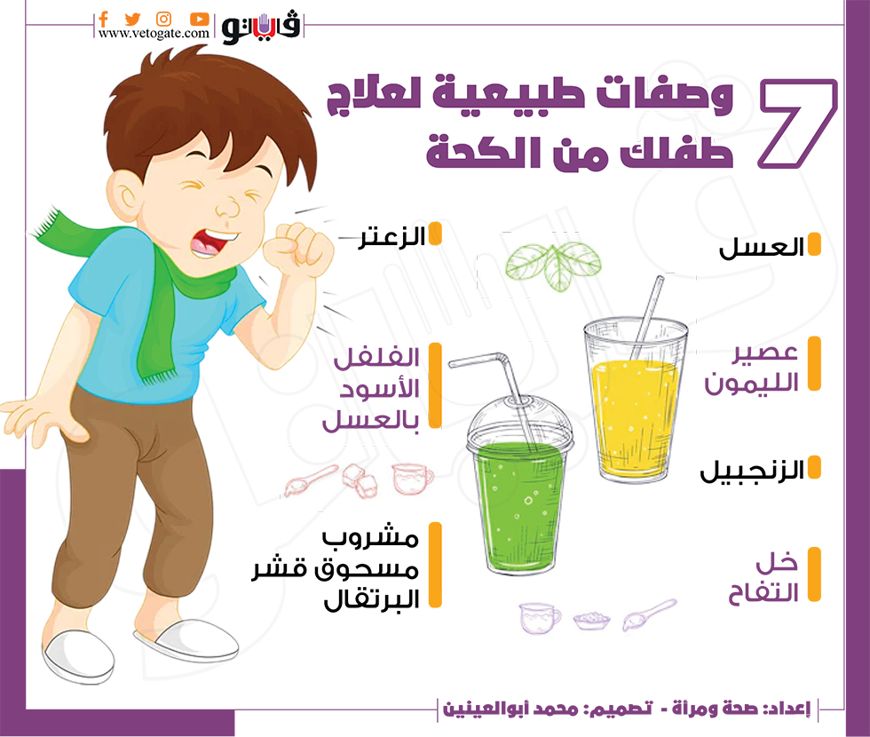 7 وصفات طبيعية لعلاج طفلك من الكحة | إنفوجراف الأربعاء 02/مارس/2022 - 06:30 م 3/2/2022 6:30:23 PM علاج الكحة شارك طباعة 18 حجم الخط شارك طباعة علاج الكحة الشديدة علاج الكحة الشديدة مع البلغم علاج الكحة الشديدة والبلغم علاج الكحة الناشفة علاج الكحة الجافة
