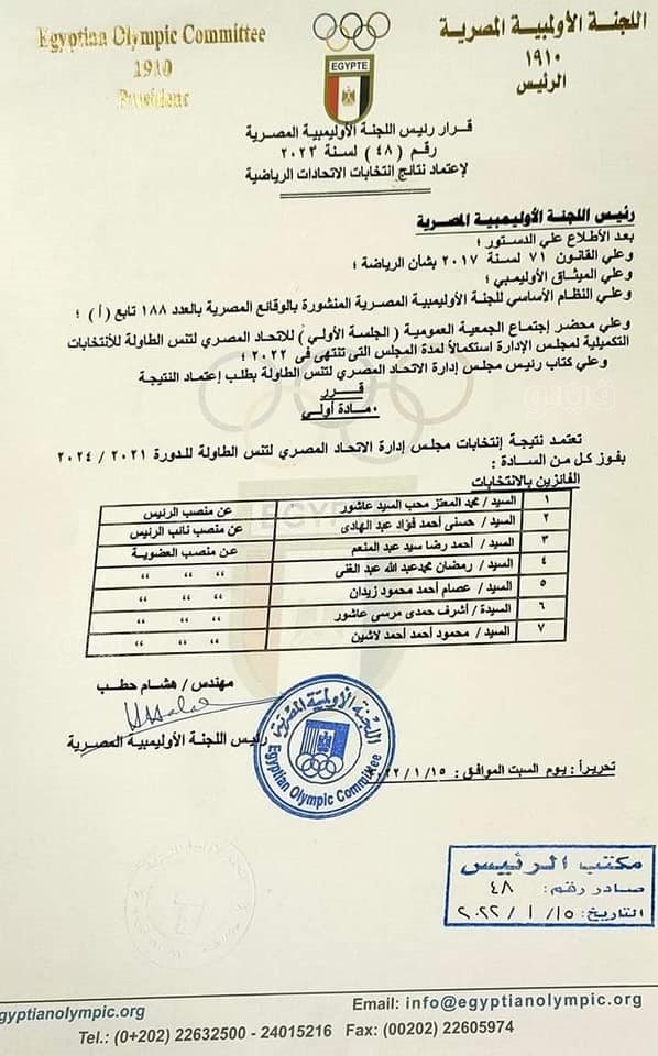 وتنشر “فيتو” صورة من قرار اللجنة الأولمبية باعتماد نتيجة انتخابات اتحاد تنس الطاولة والصادر يوم السبت وهو نفس يوم إقامة الانتخابات.