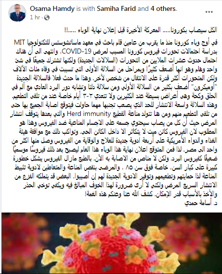 وكتب الدكتور أسامة حمدي تدوينة على الفيس بوك "الكل سيصاب بكورونا… المعركة الأخيرة قبل إعلان نهاية الوباء".