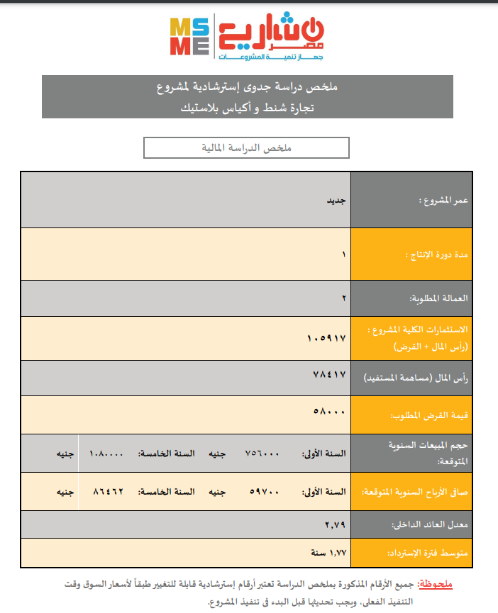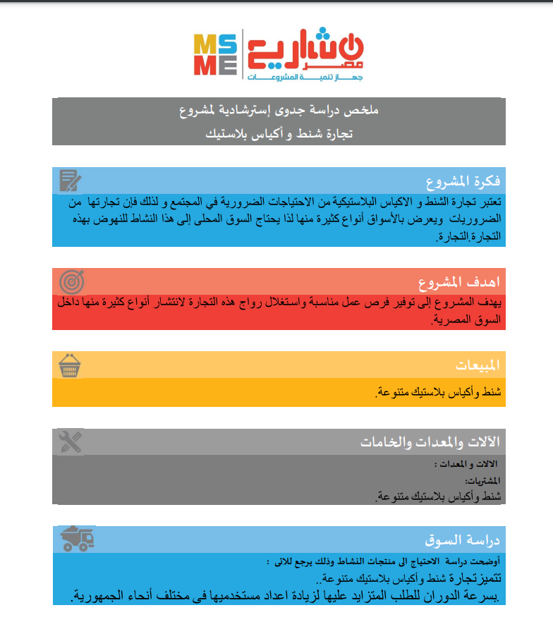 وتستعرض "فيتو" كافة التفاصيل المتعلقة بدراسة جدوى استرشادية مشروع تجاره شنط وأكياس بلاستيك، والتي أعدها جهاز تنمية المشروعات الصغيرة والمتوسطة.