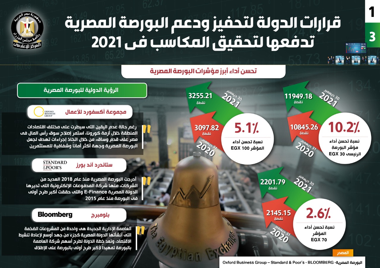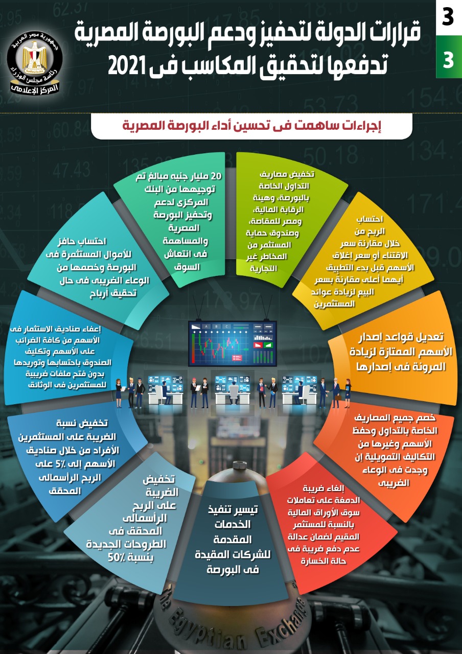 وفي هذا الصدد نشر المركز الإعلامي لمجلس الوزراء تقريرًا تضمن إنفو جرافات تسلط الضوء على المكاسب التي حققتها البورصة المصرية في عام 2021 بفضل القرارات التي اتخذتها الدولة لتحفيزها ودعمها.