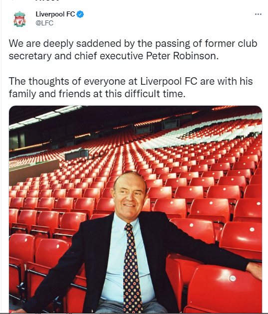 وكتب نادي ليفربول تغريدة على تويتر "نشعر بحزن عميق لوفاة سكرتير النادي والرئيس التنفيذي السابق بيتر روبنسون. تعازينا وقلوبنا جميعًا في نادي ليفربول مع عائلته وأصدقائه في هذا الوقت العصيب"