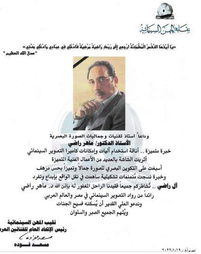وأضاف البيان: "آل راضي.. نشاطركم جميعا فقيدنا الراحل المغفور له بإذن الله د.ماهر راضي، رائد من رواد التصوير السينمائي في مصر والعالم العربي، وندعو العلي القدير أن يسكنه فسيح جناته ويلهم الجميع الصبر والسلوان".