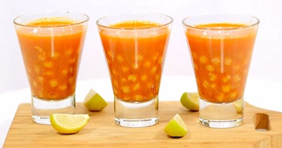 - نحضر الخلاط الكهربائى، ونقطع به الطماطم والبصل ونضيف لهم الثوم والقليل من الماء، ونضرب جيدا حتى نحصل على عصير متجانس.