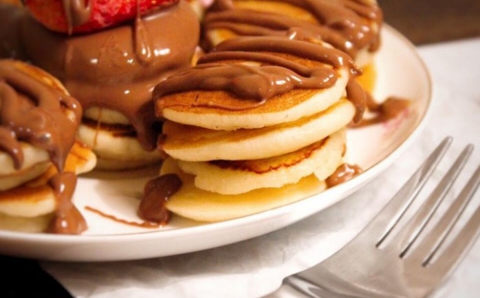 - وعند التقديم نرص البان كيك فوق بعضه بالتساوي ويمكن وضع الزبد بين طبقاته.