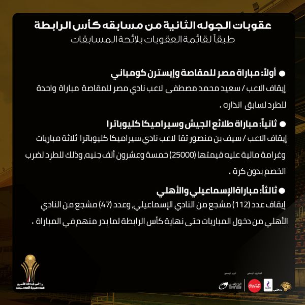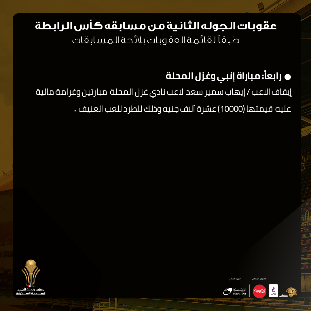 وقررت الرابطة إيقاف سعيد الونش لاعب مصر المقاصة، مباراة بعد طرده في لقاء إيسترن كومباني، بجانب إيقاف التونسي سيف تقا مدافع سيراميكا كليوباترا 3 مباريات وتغريمه 25 ألف جنيه لطرده في لقاء طلائع الجيش للاعتداء بالضرب بدون كرة.
