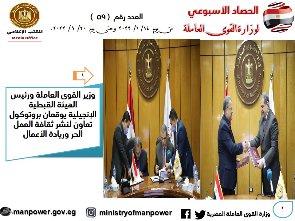 وفيما يلي تفاصيل ما جاء بالحصاد الأسبوعي، حيث وقع وزير القوي العاملة محمد سعفان، والدكتور القس أندريه زكى اسطفانوس رئيس الهيئة القبطية الإنجيلية للخدمات الاجتماعية- وحده التنمية المحلية ، بروتوكول تعاون مشترك بين الجانبين في مجال تنمية المجتمع والتدريب ونشر ثقافة العمل الحر وريادة الأعمال والسلامة والصحة المهنية، وذلك من أجل الحد من المخاطر التي تهدد سلامة الأفراد، والعمل على توفير مناخ حياة آمنة، وتدريب 4 آلاف متدرب ومتدربة خلال المرحلة الأولي دعا للشباب والنساء وخاصة الفئات الأكثر احتياجا منهم، تحقيقا لتوجيهات القيادة السياسية، في تعزيز رؤية مصر 2030.