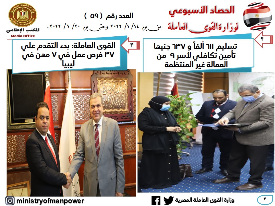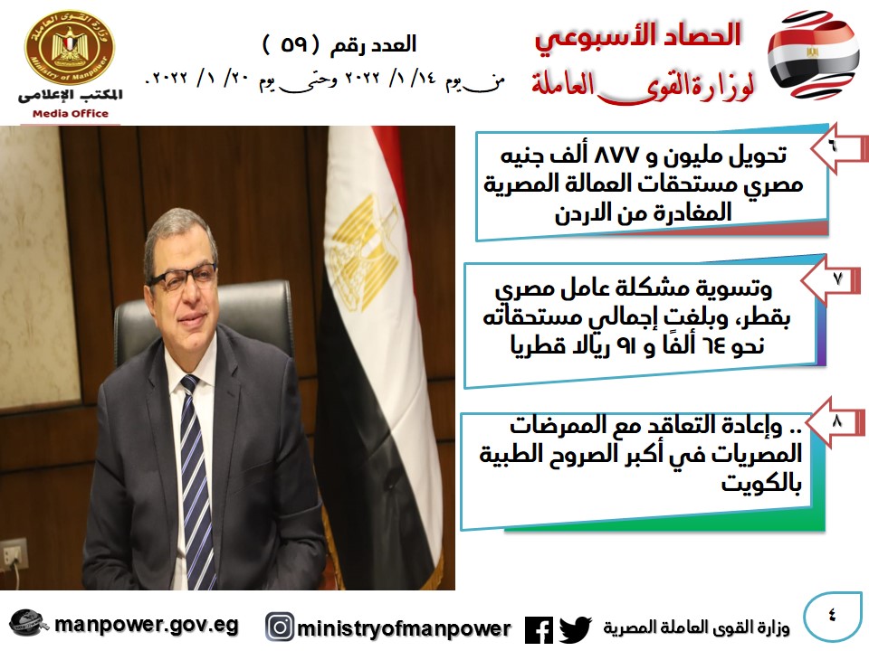 وأعلن وزير القوى العاملة،، أن مكتب التمثيل العمالي التابع للوزارة بالسفارة المصرية بعمان-الأردن، استطاع بالمتابعة اللحظية والجهود المبذولة والمقابلات مع المسئولين بمؤسسة الضمان الاجتماعي بالأردن، واستكمالا لما تم تحويله سابقا، تم تحويل القائمة الـ 65 من مستحقات الضمان الاجتماعي لنحو 57 عامل مصري لدى المؤسسة غادروا عمان نهائيا.