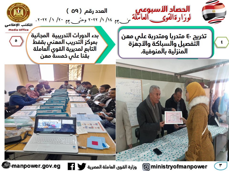 شهد حصاد الأسبوع الحالي، في وزارة القوى العاملة العديد من الأحداث المهمة خلال الفترة من 14 إلى 20 يناير الجاري- منها توقيع بروتوكول تعاون لنشر ثقافة العمل الحر وريادة الأعمال مع الهيئة القبطية الإنجيلية، وبدء التقدم علي 37 فرص عمل في 7 مهن في ليبيا ، وتسليم 611 ألفا و637 جنيها تأمين تكافلي لأسر 9 من العمالة غير المنتظمة، وبدء الدورات التدريبية المجانية بمركز التدريب المهنى بقفط التابع لمديرية القوى العاملة بقنا علي خمسة مهن، وتخريج 40 متدربا ومتدربة علي مهن التفصيل والسباكة والأجهزة المنزلية بالمنوفية .