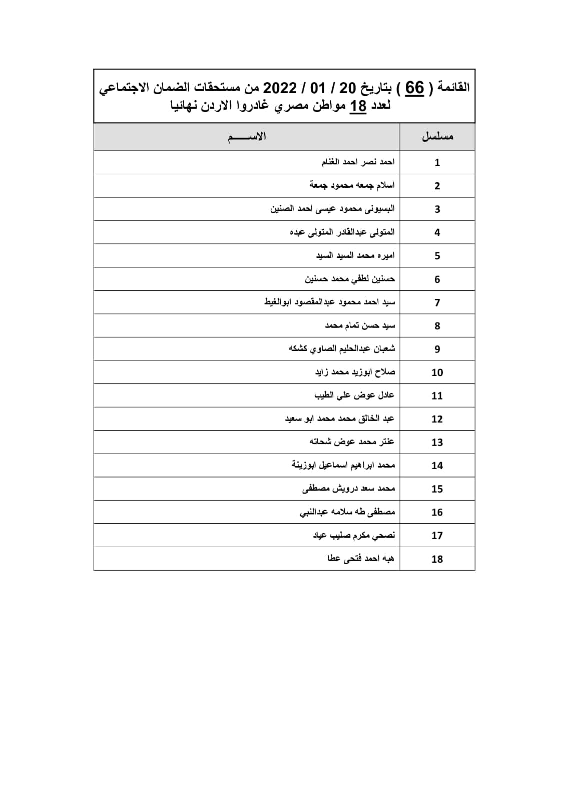 أعلن وزير القوى العاملة، محمد سعفان، أن مكتب التمثيل العمالي التابع للوزارة بالسفارة المصرية بعمان-الأردن، استطاع بالمتابعة اللحظية والجهود المبذولة والمقابلات مع المسئولين بمؤسسة الضمان الاجتماعي بالأردن، واستكمالا لما تم تحويله سابقا، تم تحويل القائمة الـ 66 من مستحقات الضمان الاجتماعي لنحو 18 عاملا مصريا لدى المؤسسة غادروا عمان نهائيا.