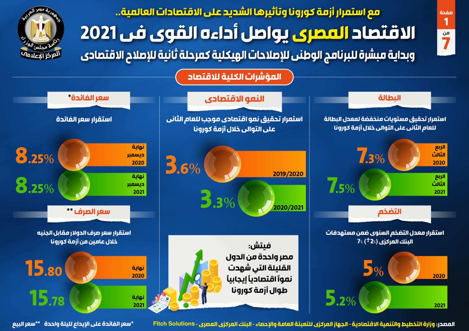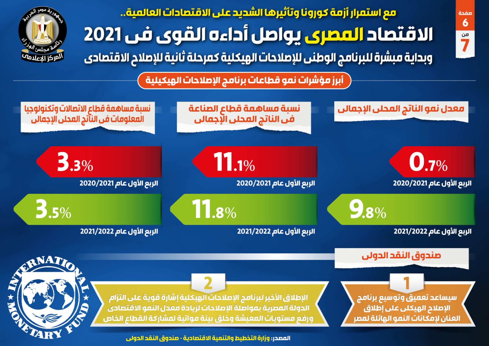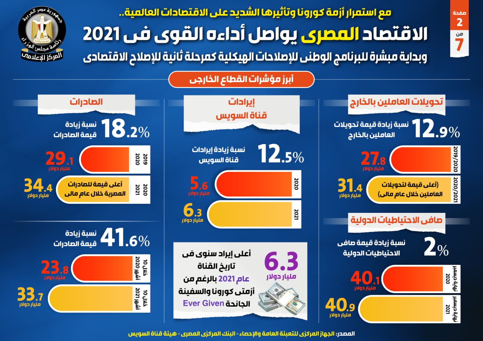 وفي إطار سلسلة تقارير حصاد قطاعات الدولة في 2021، نشر المركز الإعلامي لمجلس الوزراء تقريرًا تضمن إنفوجرافات تسلط الضوء على مواصلة الاقتصاد المصري أداءه القوي في 2021 والبداية المبشرة للإصلاحات الهيكلية كمرحلة ثانية للإصلاح الاقتصادي.