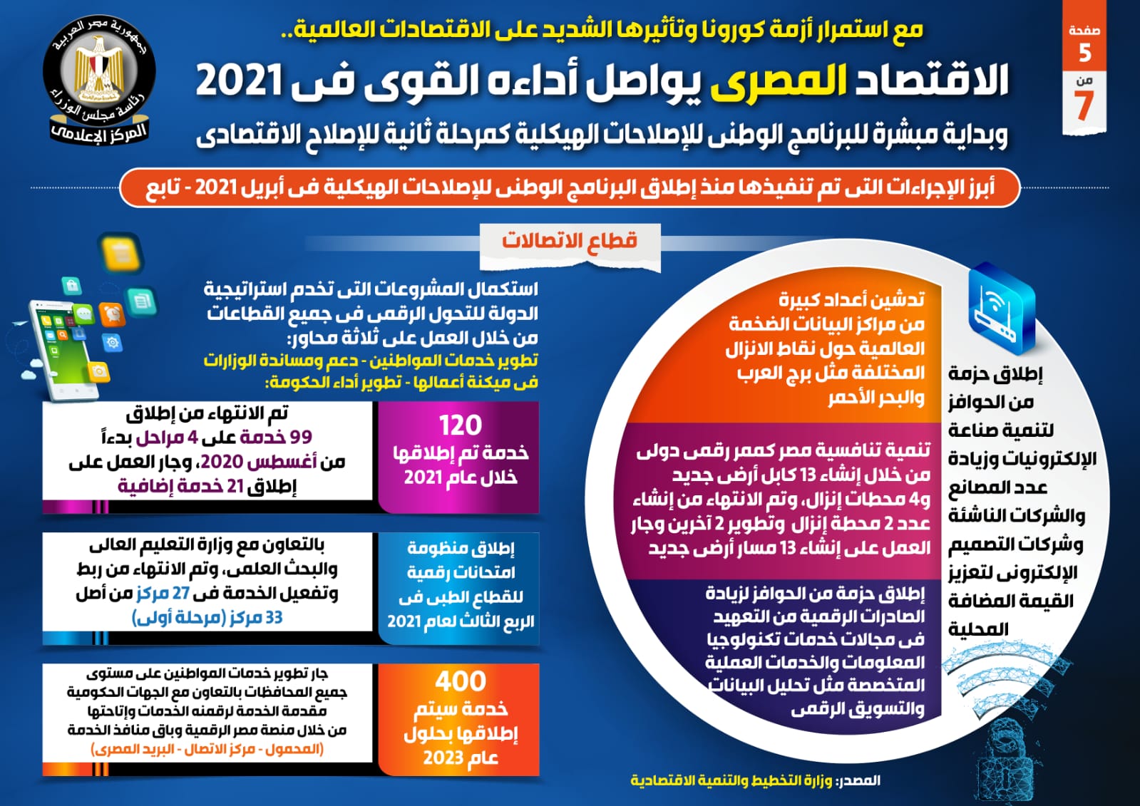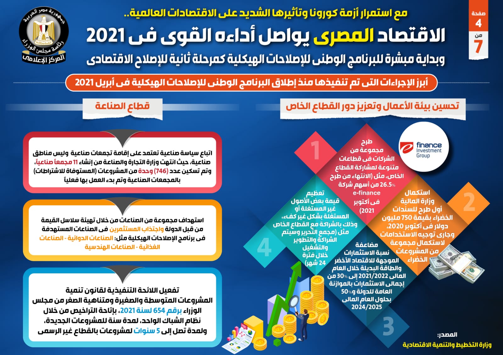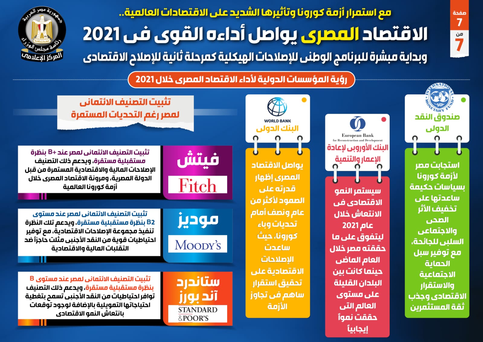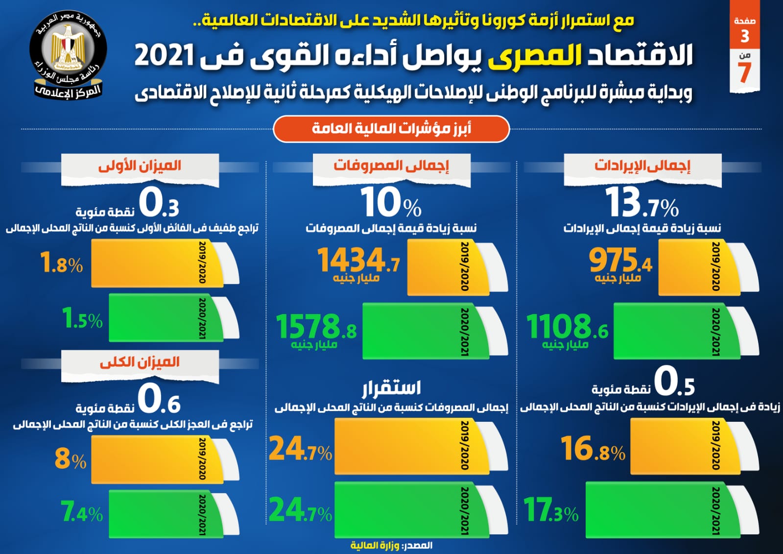 وفي إطار سلسلة تقارير حصاد قطاعات الدولة في 2021، نشر المركز الإعلامي لمجلس الوزراء تقريرًا تضمن إنفوجرافات تسلط الضوء على مواصلة الاقتصاد المصري أداءه القوي في 2021 والبداية المبشرة للإصلاحات الهيكلية كمرحلة ثانية للإصلاح الاقتصادي.