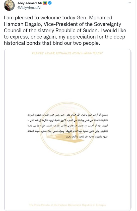 وكتب آبي أحمد في رسالته عند استقبال الفريق دقلو تغريدة على تويتر: "يسعدني أن أرحب اليوم بالجنرال محمد حمدان دقلو نائب رئيس مجلس السيادة في جمهورية السودان الشقيقة بالاصالة عن نفسي وبالنيابة عن الشعب الإثيوبي قاطبة لزيارتة الكريمة الي بلدة الثاني اثيوبيا".
