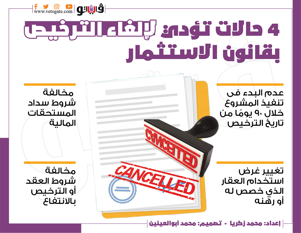 ٤ حالات تؤدي لإلغاء الترخيص بقانون الاستثمار|انفوجراف الأحد 23/يناير/2022 - 08:47 م 1/23/2022 8:47:43 PM مجلس النواب محمد زكريا شارك طباعة 18 حجم الخط شارك طباعة مجلس النواب قانون الاستثمار الاستثمار شروط العقد الانتفاع سحب العقارات