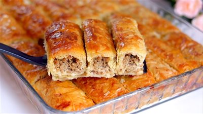 * رصى الجلاش طبقات فى صينية الفرن ثم يدهن بالسمنة المذابة بين الطبقات ويحشى بالمكسرات