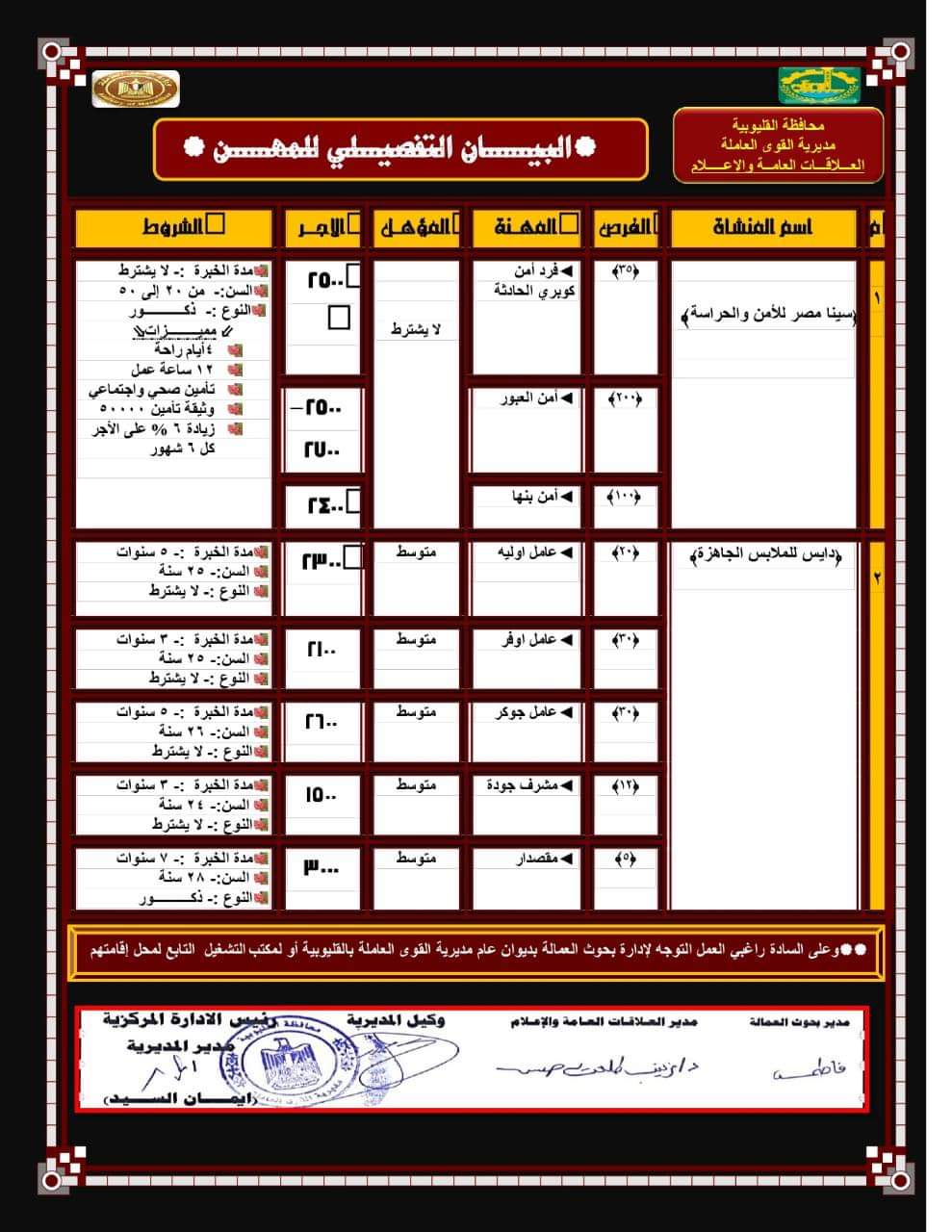 وأشارت وزارة القوى العاملة إلى أنها وفَّرت مديرية القوى العاملة بالقليوبية مجموعة من فرص العمل شملت: 10 محاسبين يجيدون الحاسب الآلي، و2 أمين خزينة، و90 عامل إنتاج، و40 عامل عادي، و10 عاملي ثلاجات، و4 مساعدي حداد، و4 كهربائيين، و10 أفراد أمن.