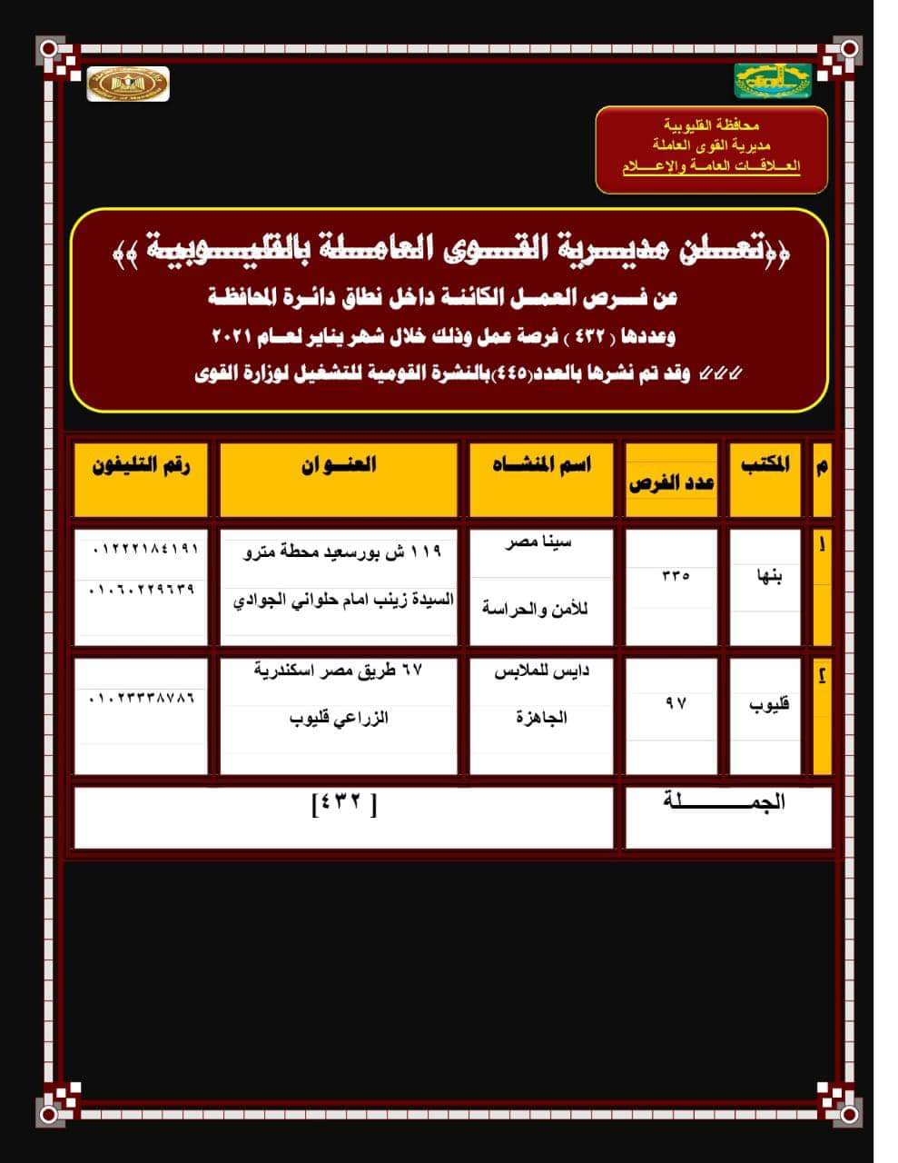أعلنت مديرية القوى العاملة بـ القليوبية عن توفير 432 فرصة عمل بالتعاون مع القطاع الخاص لحملة المؤهلات المتوسطة والعليا وبدون مؤهل في عددا من الشركات والمصانع بنطاق المحافظة.