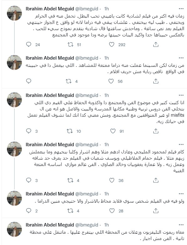 وكتب إبراهيم عبد المجيد تغريدة على تويتر: "زمان فيه اكتر من فيلم لشادية كانت ياعيني تحب البطل. تحمل منه في الحرام ويختفي. طيب ليه بيختفي. علشان يبقي فيه دراما لانه لو وافق على الجواز حينتهي الفيلم بعد نص ساعة. وماحدش ساعتها قال شادية بتقدم نموذجا سيئا للحب. بالعكس حبيناها جدا واكيد البنات حبيتها برضه ودا موجود في المجتمع".