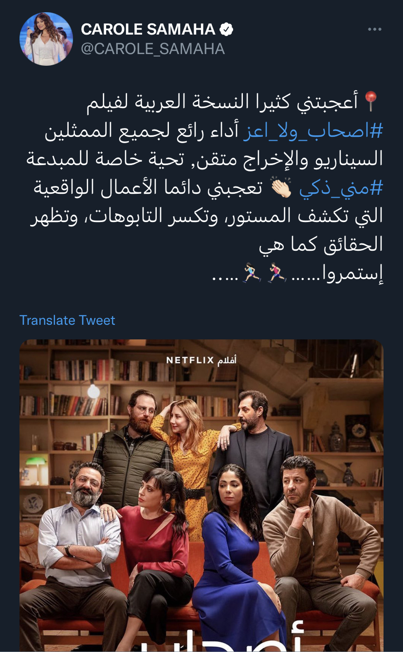 عبرت الفنانة اللبنانية كارول سماحة، عبر حسابها الشخصي على موقع التغريدات الشهير "تويتر" عن إعجابها بفيلم "أصحاب ولا أعز" للفنانة منى زكي والفنان إياد نصار والذي أثار جدلا واسعا خلال الأيام الماضية.