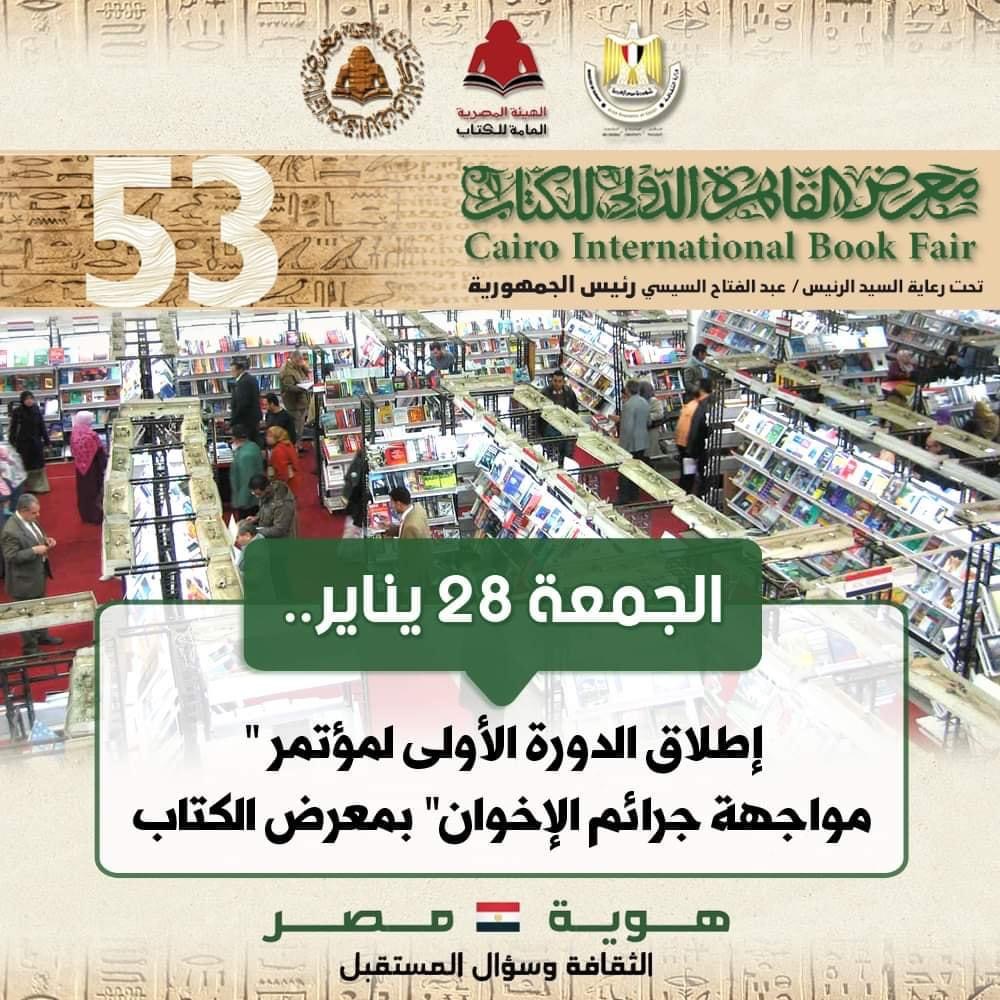 يعقد يوم الجمعة المقبل الموافق 28 يناير الجاري، على هامش النسخة 53 لمعرض القاهرة الدولي للكتاب، الدورة الأولى من مؤتمر "مواجهة جرائم الإخوان.. دراسات وتوثيق"، تحت شعار "انتصار الهوية"، والذي يأتي بمبادرة من دار سما للنشر والتوزيع، بالتعاون مع الهيئة المصرية العامة للكتاب.