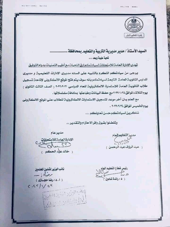 وجهت وزارة التربية والتعليم والتعليم الفني خطابا هاما وعاجلا لجميع المديريات التعليمية بشأن تسجيل استمارة التقدم لامتحانات الثانوية العامة 2022.
