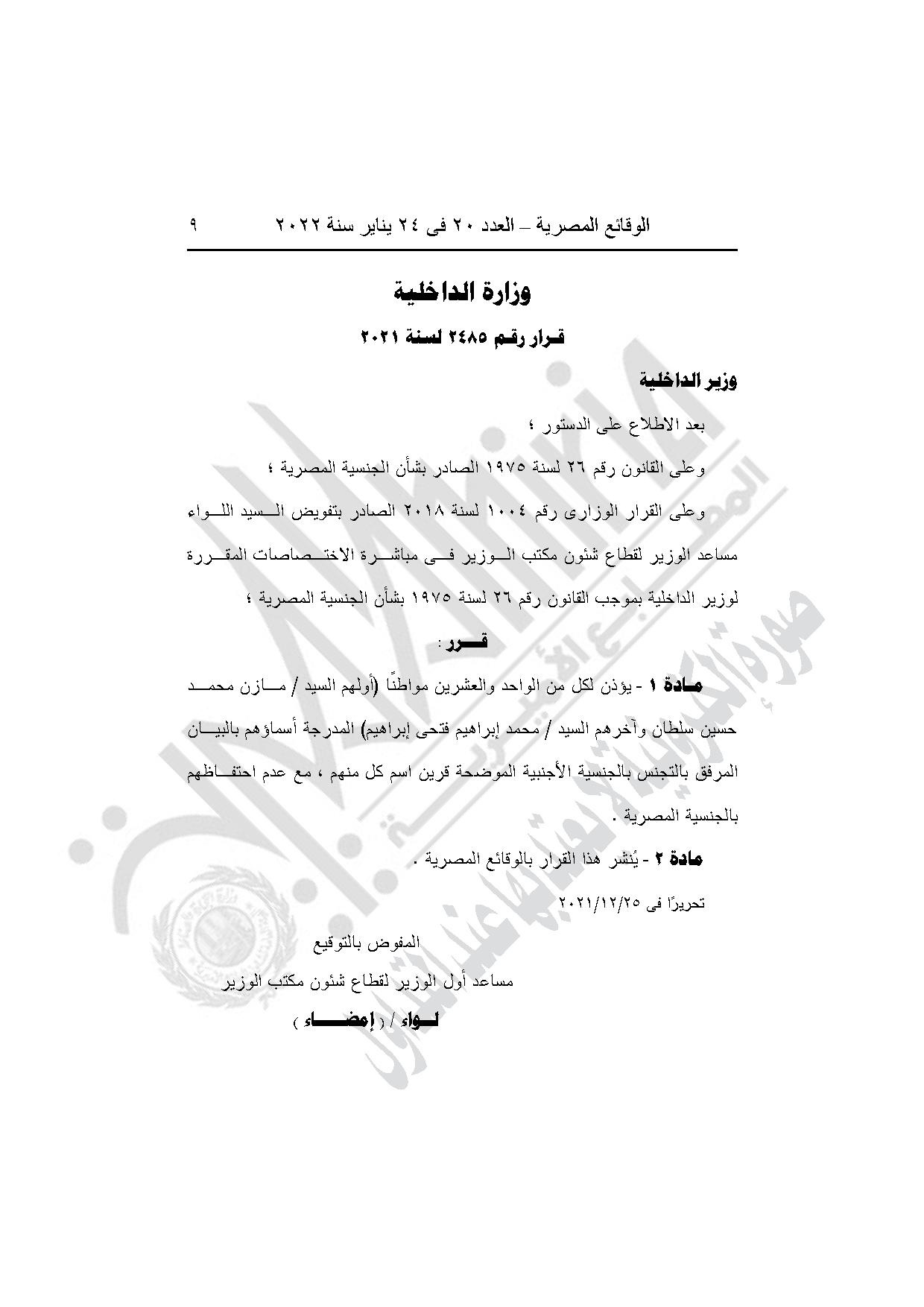 والقرار رقم 2485 لسنة 2021، بالأذن لكل من الواحد والعشرين (أولهم مازن محمد حسين سلطان، وآخرهم محمد إبراهيم فتحي إبراهيم) المدرجة أسماؤهم بالبيان، بالتجنس بالجنسية الأجنبية الموضحة قرين اسم كل منهم، مع عدم احتفاظهم بالجنسية المصرية.
