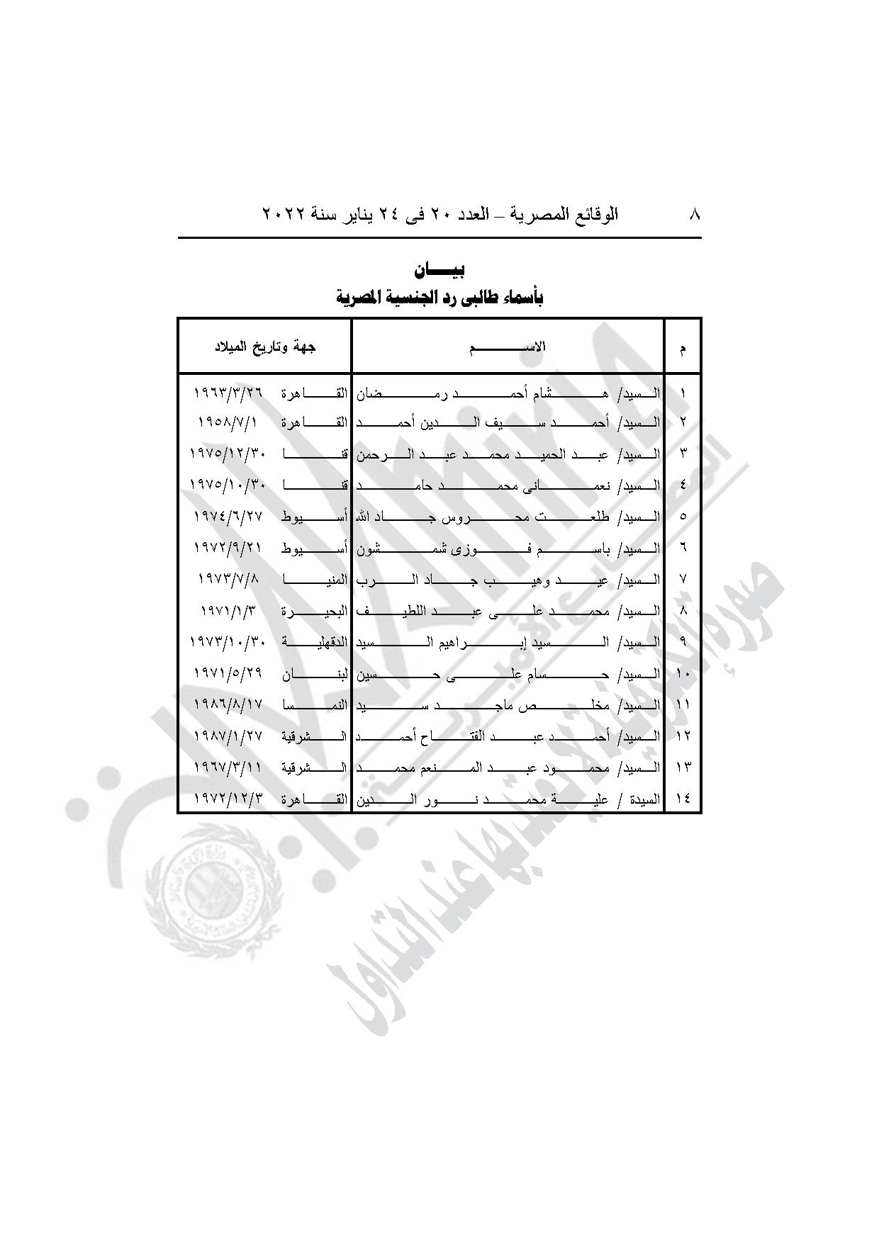 نشرت جريدة الوقائع المصرية في عددها رقم 20، الصادر في 24 يناير 2022، قرارات وزارة الداخلية بشأن سحب الجنسية المصرية من 21 مواطنًا، ورد الجنسية المصرية لـ14 شخصًا، مع الأذن 43 مصريًا بالتجنس بجنسية أجنبية مع احتفاظهم بالجنسية المصرية.
