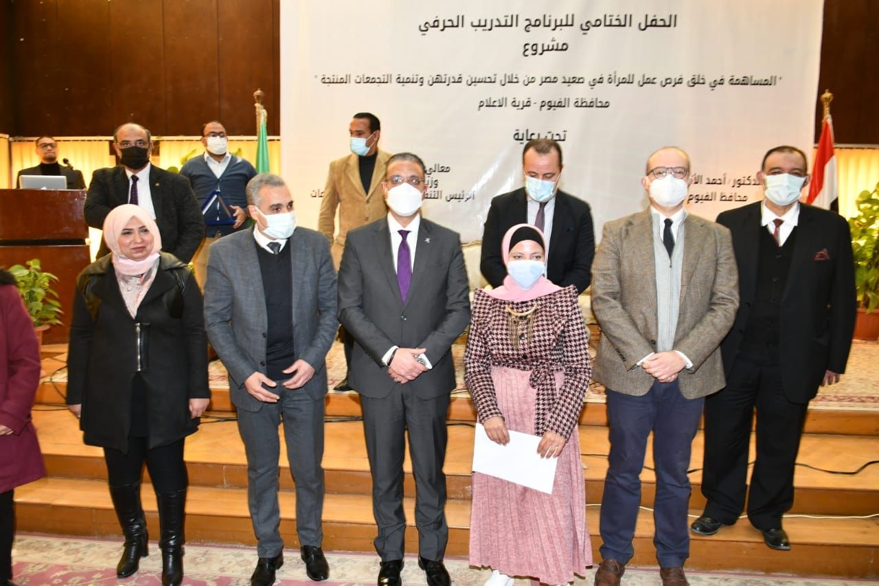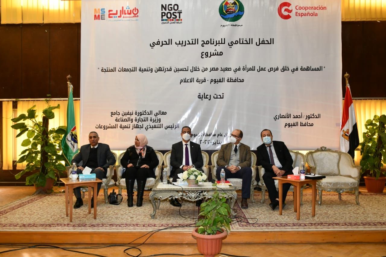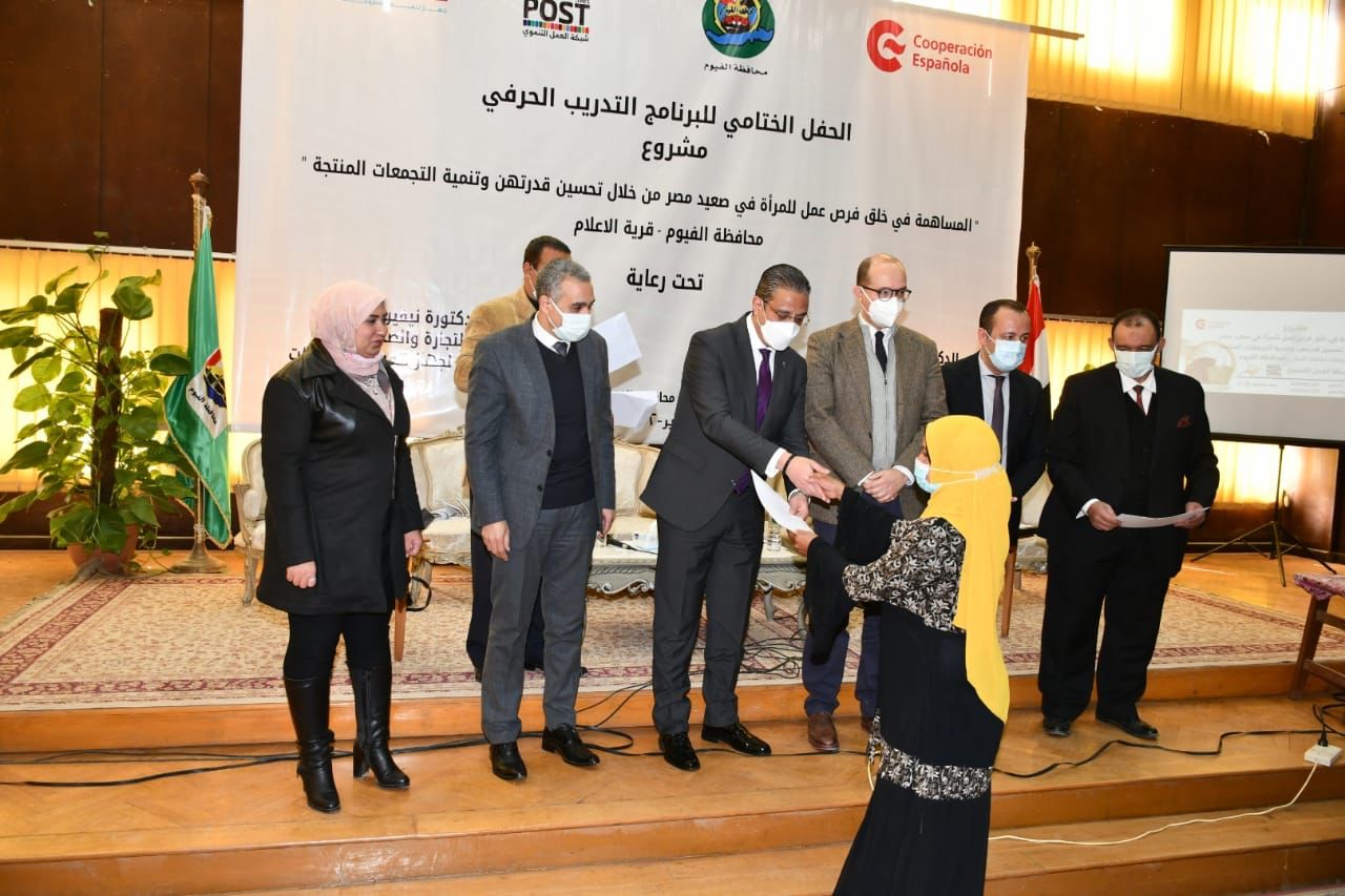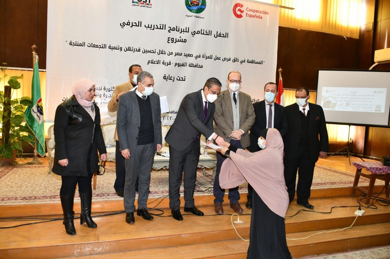 شهد الدكتور أحمد الأنصاري، محافظ الفيوم، الحفل الختامي للبرنامج التدريبي الحرفي "المساهمة في خلق فرص عمل للمرأة بصعيد مصر من خلال تحسين قدرتهن وتنمية التجمعات المنتجة"، الممول من الوكالة الاسبانية بالقاهرة، الذي تنفذه شبكة العمل التنموي، بالتنسيق مع جهاز تنمية المشروعات المتوسطة والصغيرة ومتناهية الصغر بالمحافظة.