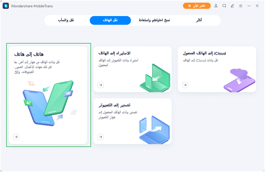 بعد التثبيت نقوم بفتح البرنامج لتظهر الشاشة الرئيسية، نختار تبويب نقل الهاتف من بين الخيارات.