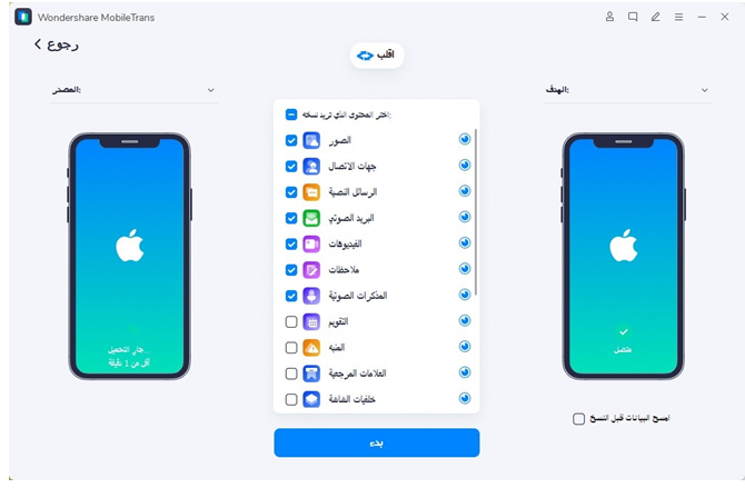 تحتوي قائمة نقل الملفات من الايفون الى الايفون على عدة أنواع للملفات مثل الصور وجهات الاتصال والرسائل النصية وغيرها نقوم باختيار الصور في هذه الحالة، ومن ثم النقر على زر " بدء " لبدء عملية النقل.