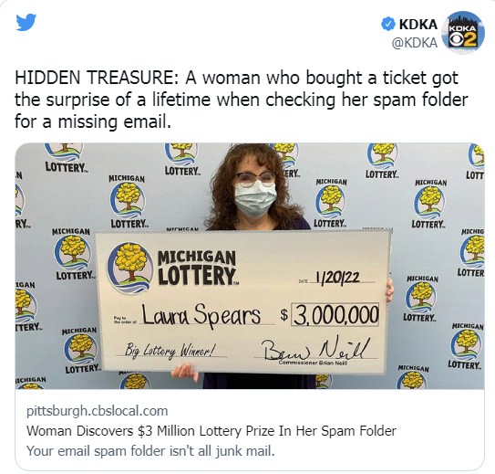 اكتشفت امرأة أمريكية أنها ربحت جائزة "يانصيب" قيمتها 3 ملايين دولار، وذلك أثناء تحققها من مجلد البريد الإلكتروني العشوائي بحثًا عن رسالة مفقودة.
