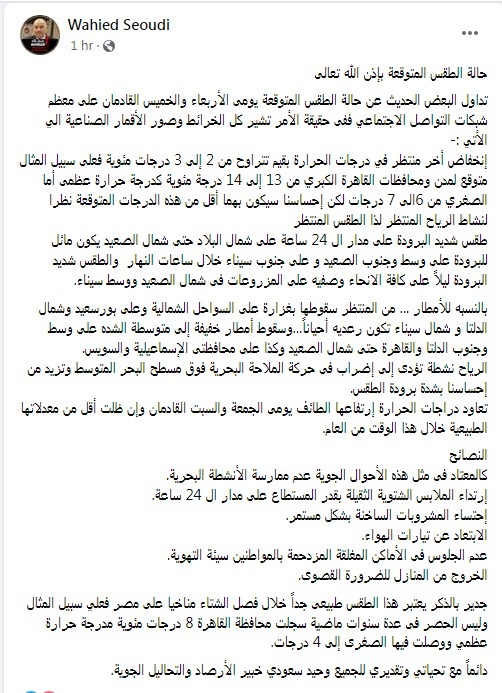 وعن توقعاته للطقس خلال يومي الأربعاء والخميس كتب وحيد سعودي تدوينة على فيس بوك قال فيها: "حالة الطقس المتوقعة بإذن الله تعالى.. تداول البعض الحديث عن حالة الطقس المتوقعة يومي الأربعاء والخميس القادمين على معظم شبكات التواصل الاجتماعي".