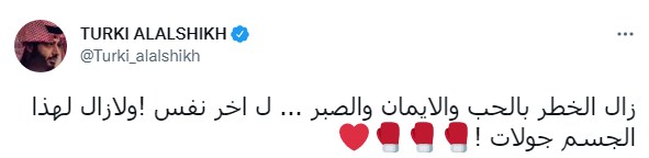 وكتب تركي آل الشيخ تغريدة على تويتر: "زال الخطر بالحب والايمان والصبر... لآخر نفس !ولا زال لهذا الجسم جولات!"