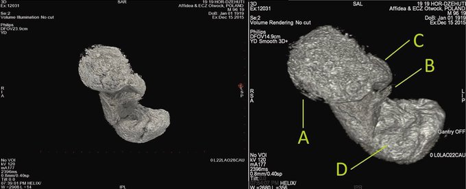 وقالت مارزينا أوزاريكزيلكي، عالمة الأنثروبولوجيا وقال عالم آثار من جامعة وارسو لوكالة الأنباء البولندية: "كنا على وشك الانتهاء من المشروع.. عندما نظر زوجي ستانيسلاو، عالم الآثار المصرية، في صور الأشعة السينية ورأى في رحم المرأة المتوفاة.. قدما صغيرة".