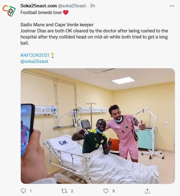 ذكرت تقارير إعلامية، الثلاثاء، أنه تم نقل لاعب نادي ليفربول الإنجليزي، ساديو ماني ، إلى المستشفى بعد اصطدامه القوي بحارس منتخب الرأس الأخضر في مباراة منتخب بلاده السنغال ضمن منافسات الدور الستة عشر من بطولة كأس أمم أفريقيا.