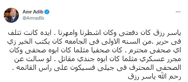 وكتب عمرو أديب تغريدة على تويتر "ياسر رزق كان دفعتى وكان اشطرنا وامهرنا. ايده كانت تتلف فى حرير.من السنه الاولى فى الجامعه كان يكتب الخير زي اي صحفى محترم. كان صحفيا مثلما كان ابوه صحفى وكان مجرر عسكري مثلما كان ابوه جندي مقاتل. لو سالت عن الصحفى المحترف فى جيلى فسيكون على راس القائمه. رحم الله ياسر رزق".