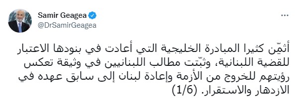 وكتب سمير جعجع تغريدة على تويتر "أثمِّن كثيرا المبادرة الخليجية التي أعادت في بنودها الاعتبار للقضية اللبنانية، وثبّتت مطالب اللبنانيين في وثيقة تعكس رؤيتهم للخروج من الأزمة وإعادة لبنان إلى سابق عهده في الازدهار والاستقرار".