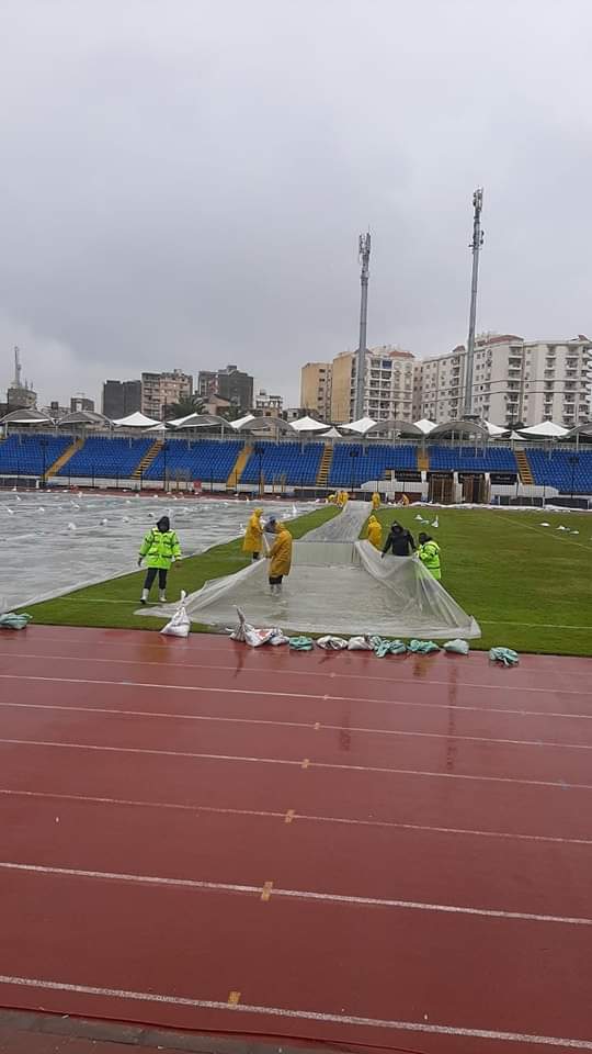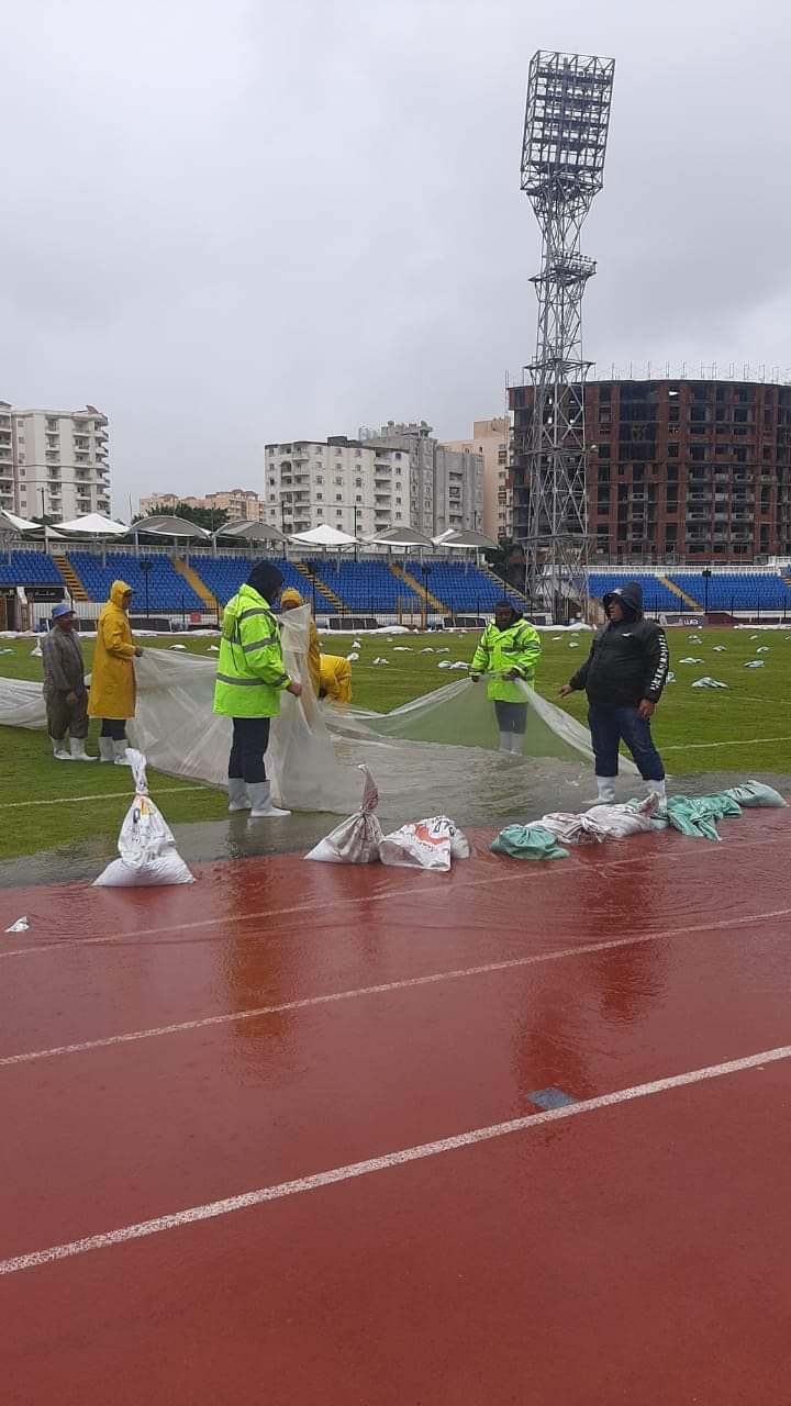 غطى مسئولو استاد الإسكندرية برئاسة الدكتور محمد عبدالرازق مدير الاستاد، أرضية ملعب كرة القدم بالمشمع في محاولة لحماية الأرضية من مياه الأمطار الغزيرة التي تسقط علي المدينة منذ الصباح وعدم تضررها ومنع تراكم المياه.