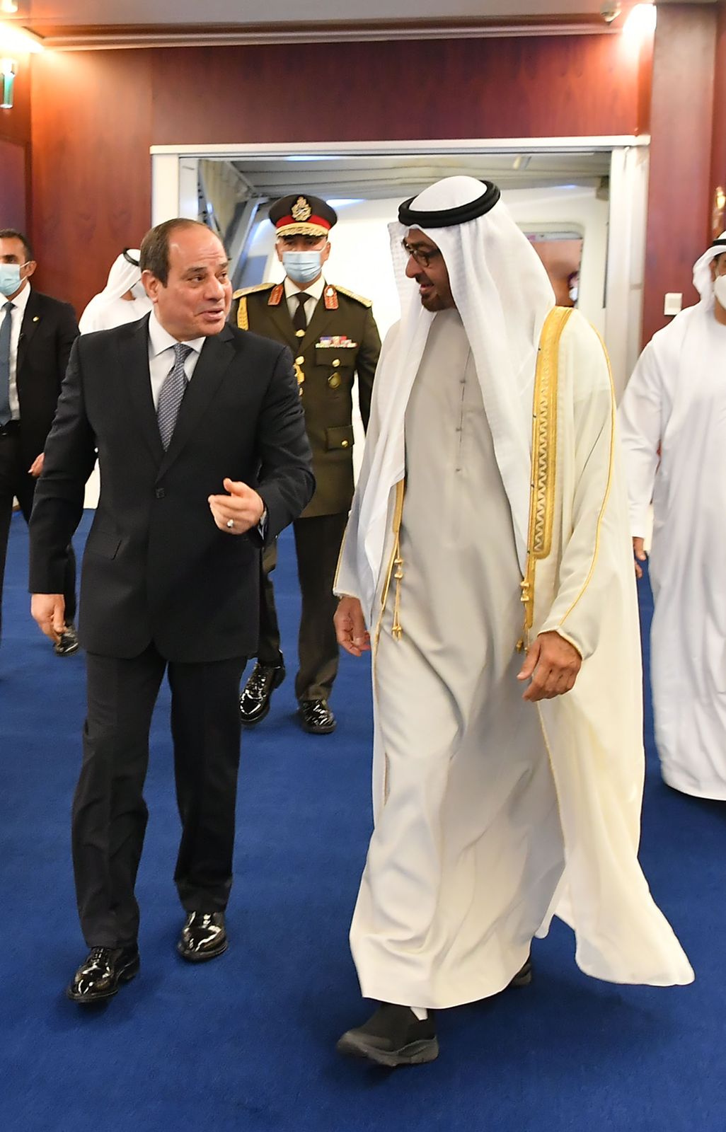 من جانبه أعرب الرئيس عن اعتزازه بحفاوة الاستقبال، مؤكدًا متانة العلاقات المصرية الإماراتية وقوتها وما تتميز به من خصوصية وحرص مصر على تطوير التعاون والتنسيق الثنائي الوثيق لما فيه مصلحة الشعبين الشقيقين والأمة العربية، خاصةً من خلال تكثيف وتيرة انعقاد اللقاءات الثنائية بين كبار المسئولين من البلدين بصورة دورية للتنسيق الحثيث والمتبادل تجاه التطورات المتلاحقة التي تشهدها حاليًا منطقة الشرق الأوسط وتعزيز وحدة الصف والعمل العربي والإسلامي المشترك في مواجهة مختلف التحديات الإقليمية.