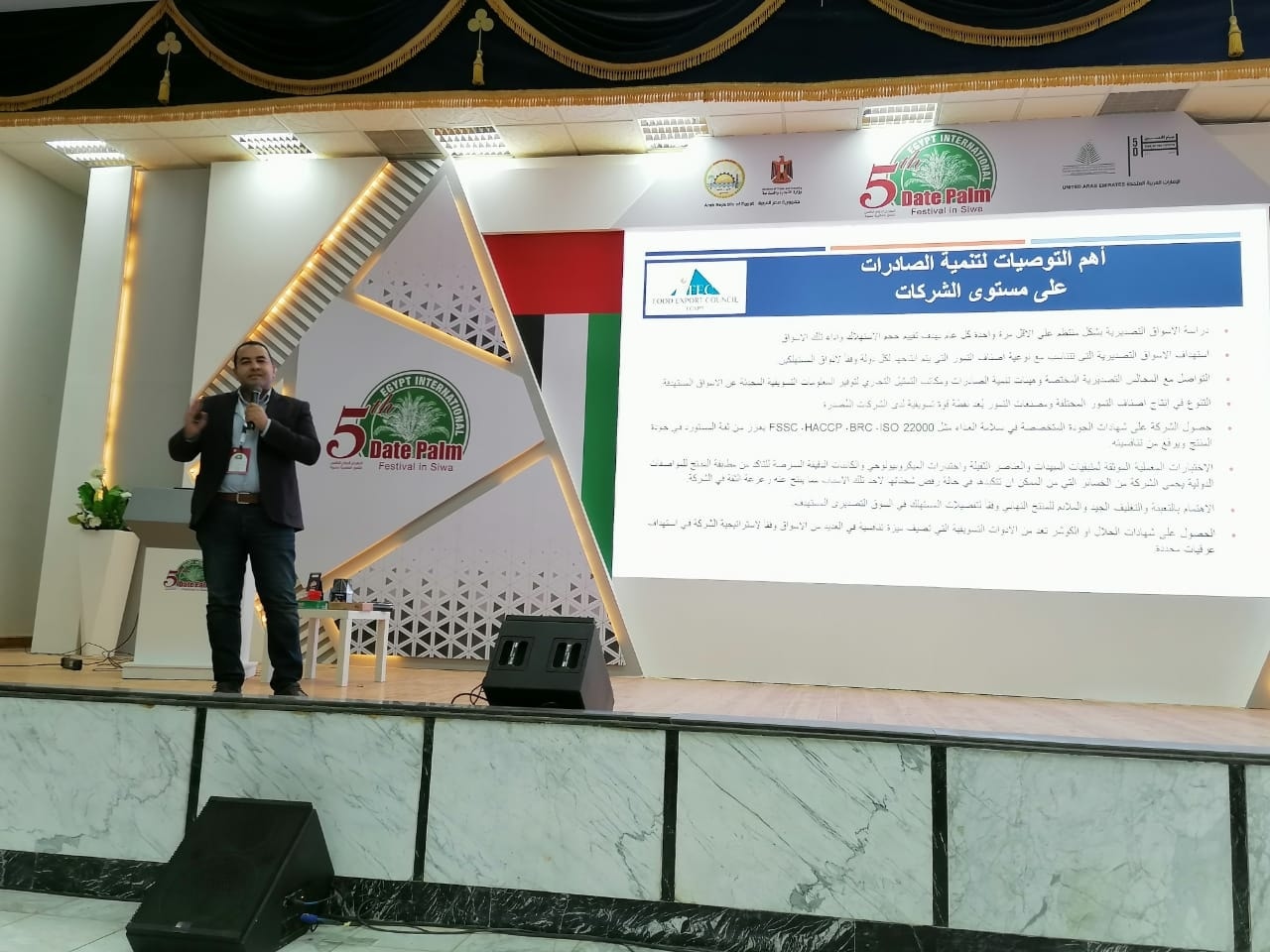 وقام المهندس تميم الضوى نائب المدير التنفيذي للمجلس بتقديم محاضرة عن الاسواق العالمية الواعدة للتمور واهم التوصيات لتنمية صادرات التمور وذلك على هامش الندوات العلمية التى تمت فى اليوم الثانى للمهرجان.