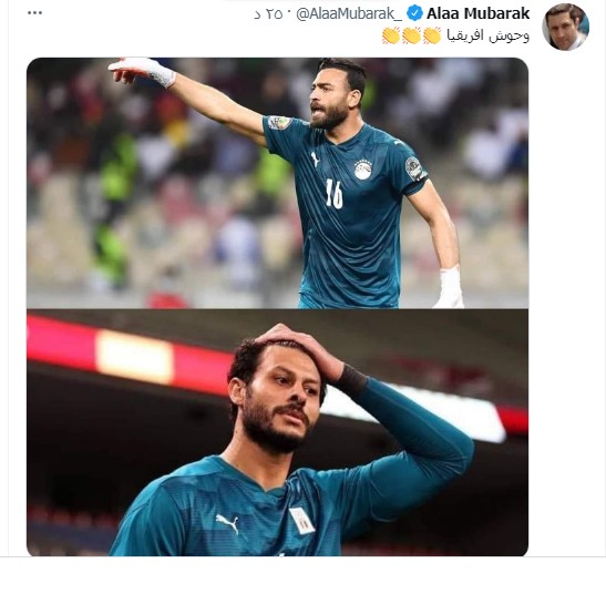 ونشر علاء مبارك في حسابه الشخصي على موقع التغريدات تويتر صورتين للحارسين الشناوي وأبو جبل معلقًا عليها قائلًا "وحوش أفريقيا".