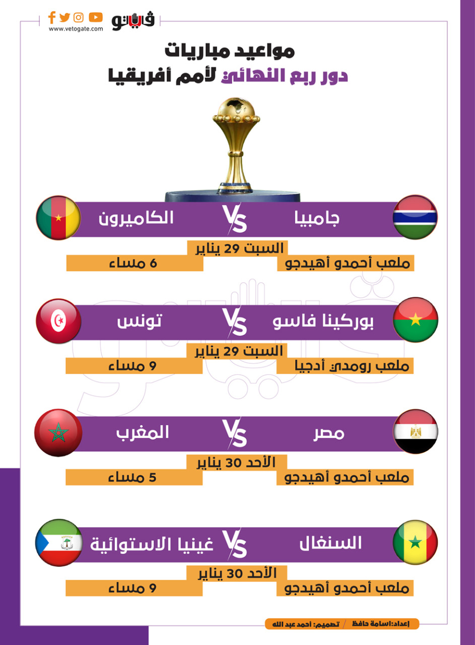 مواعيد مباريات دور ربع النهائي لأمم أفريقيا | انفوجراف الأربعاء 26/يناير/2022 - 11:55 م 1/26/2022 11:55:36 PM مواعيد مباريات دور ربع النهائي لأمم أفريقيا اسامة حافظ شارك طباعة 18 حجم الخط شارك طباعة مصر افريقيا المغرب بوركينا فاسو أمم إفريقيا دور ربع النهائى