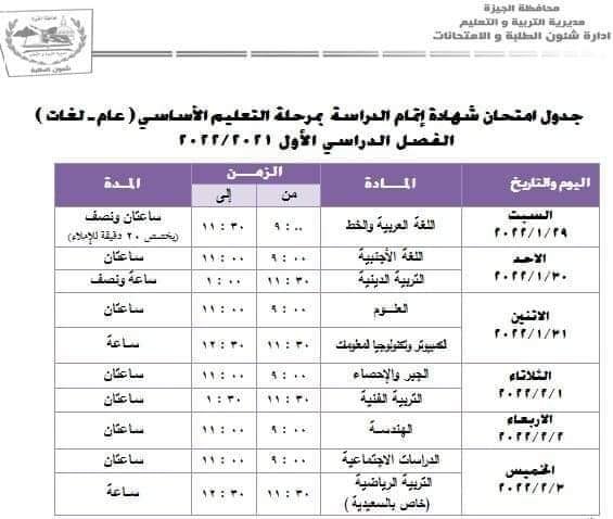 جدول امتحانات الترم الأول للشهادة الإعدادية 2022 بالجيزة