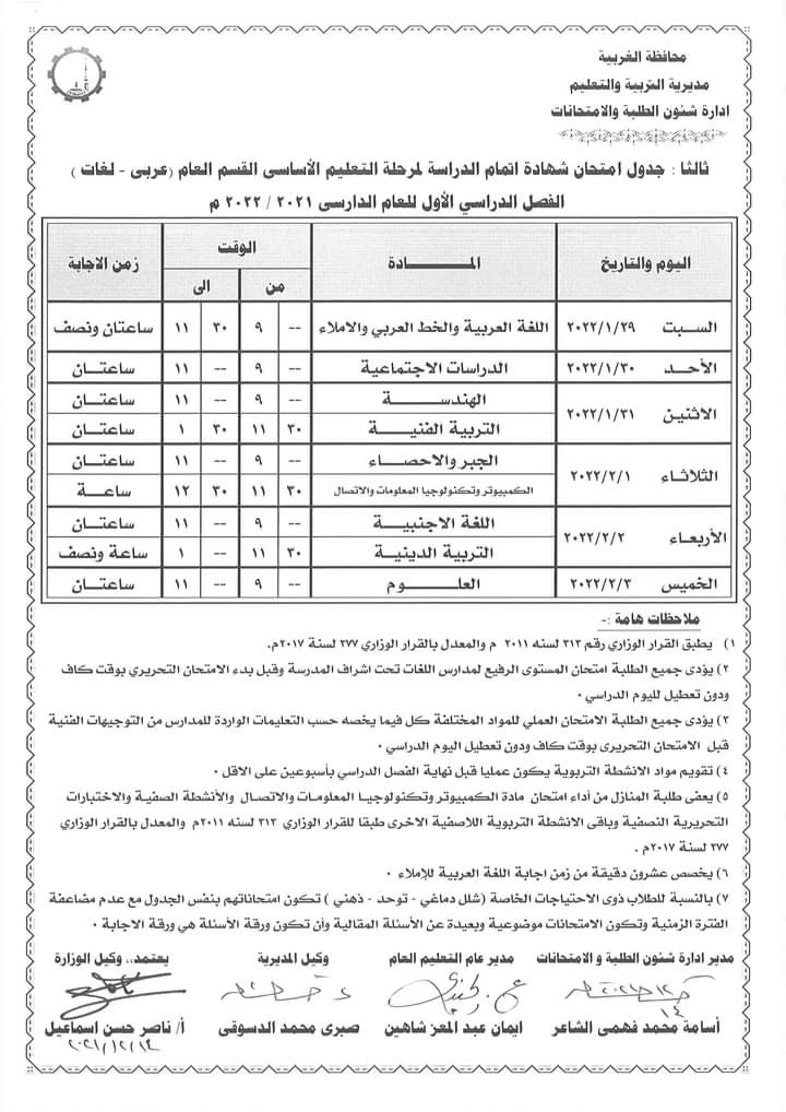 جدول امتحانات الصف الثالث الإعدادي بالغربية
