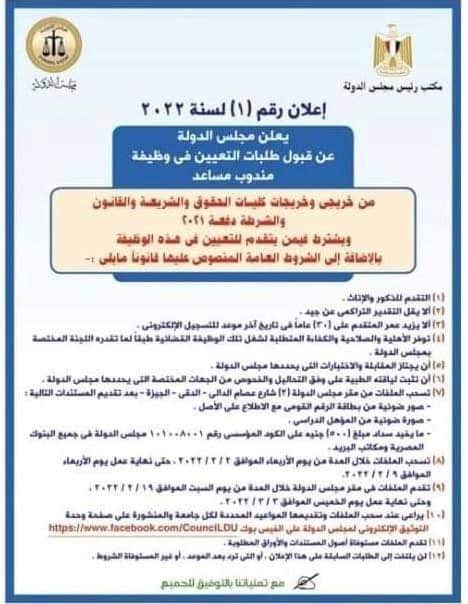 وأضاف المستشار طه كرسوع الأمين العام لمجلس الدولة- نائب رئيس مجلس الدولة، إن من شروط الإعلان أن يكون المتقدم من الخريجين والخريجات الحاصلين على تقدير جيد على الأقل، وألا يزيد العمر على 30 عامًا، وأن يجتاز المقابلة الشخصية، وأن تثبت لياقته الصحية.