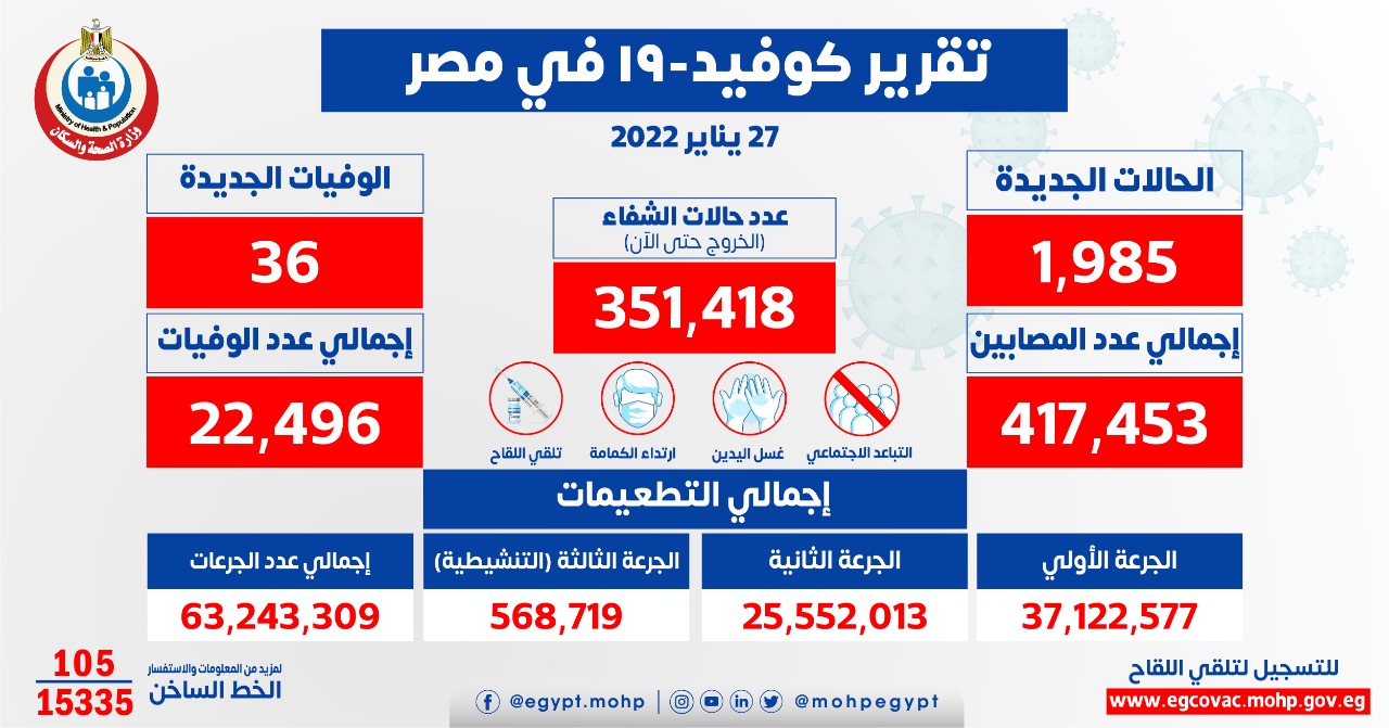 وأوضح الدكتور حسام عبد الغفار المتحدث الرسمي لوزارة الصحة والسكان، أنه تم تسجيل 1985 حالة جديدة ثبتت إيجابية تحاليلها للفيروس ومتحوراته، وذلك ضمن إجراءات الترصد والتقصي والفحوصات اللازمة التي تُجريها الوزارة وفقًا لإرشادات منظمة الصحة العالمية، لافتًا إلى وفاة 36 حالة جديدة.